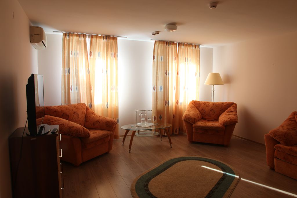 В номере: одна двуспальная кровать, прикроватные тумбы, шкаф, журнальный столик, мягкая мебель, кондиционер, спутниковое телевидение, холодильник, электрочайник