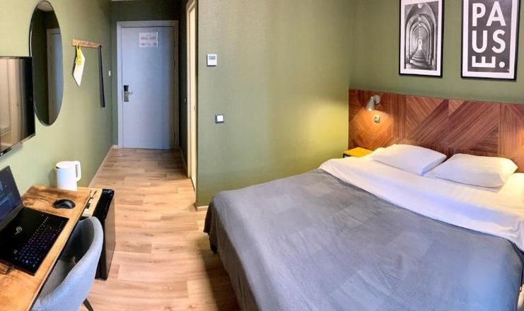 В номере: вешалка, зеркало, кровать двуспальная, прикроватные тумбочки, стол, стулья, шкаф, кондиционер, мини-холодильник, телевизор, чайная станция