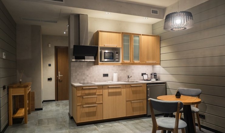 Оборудование: Телевизор, холодильник, электрочайник, варочная панель, микроволновая печь, кондиционер, посудомоечная машина