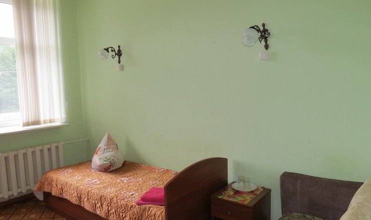 В номере: вешалка, зеркало, кровать односпальная, прикроватные тумбочки, стол, стул, шкаф, раскладушка на доп. место